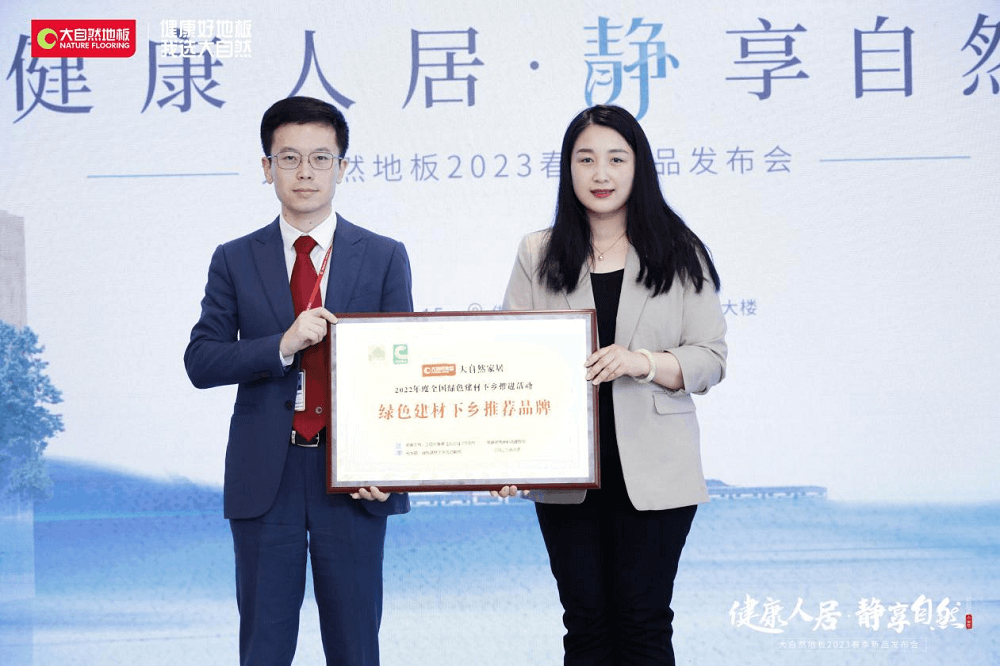 一直以來,大自然地板積極助力綠色健康產(chǎn)品走進更多的家庭,為中國健康人居建設不斷添磚加瓦。發(fā)布會現(xiàn)場,中國建筑材料流通協(xié)副會長馮斯靜表示:大自然家居旗下的強化地板和實木復合地板,成功入選由工信部公布的全國綠色建材產(chǎn)品清單和企業(yè)名錄,其產(chǎn)品質(zhì)量、安全性、環(huán)保性、節(jié)能性、低碳化等指標都優(yōu)于常規(guī)產(chǎn)品,因此大自然家居也被中國建筑材料流通協(xié)會評審成為“綠色建材下鄉(xiāng)推薦品牌”,現(xiàn)場特授予此榮譽獎牌。