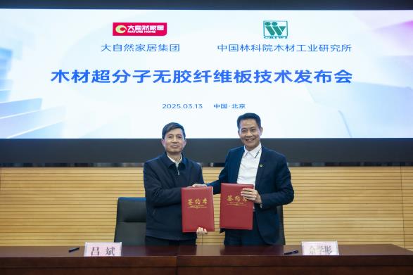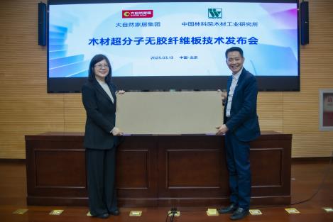 2025年3月13日,中國(guó)林業(yè)科學(xué)研究院木材工業(yè)研究所與大自然家居(中國(guó))有限公司在北京共同發(fā)布“木材超分子無(wú)膠纖維板技術(shù)”
