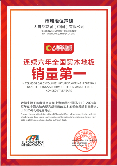 歐睿咨詢作為全球領(lǐng)先的權(quán)威市場(chǎng)調(diào)研機(jī)構(gòu),其數(shù)據(jù)以高度公信力享譽(yù)行業(yè)。據(jù)歐睿最新數(shù)據(jù)顯示,大自然家居實(shí)木地板連續(xù)六年穩(wěn)居“全國(guó)實(shí)木地板銷量第一”。這一成績(jī),是大自然家居強(qiáng)大的產(chǎn)品力與市場(chǎng)競(jìng)爭(zhēng)力的表現(xiàn),更印證其在消費(fèi)者心中的卓越口碑。